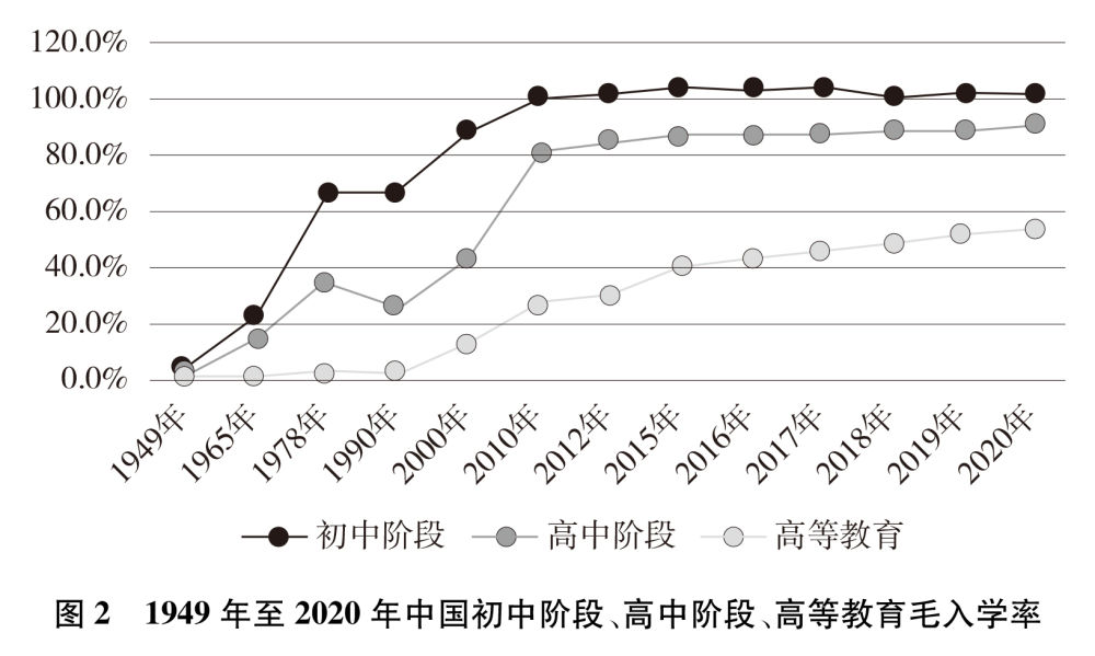 教育机会更加均等。中国教育事业优先发展不断深化,中国青年享有更加平等、更高质量的教育机会。2021年,中国义务教育巩固率达95.4%;高中阶段毛入学率达91.4%;高等教育毛入学率达57.8%、在学总规模达4430万人,居世界第一,越来越多的青年打开了通往成功成才大门的重要路径。覆盖学前教育至研究生教育的学生资助政策体系建成且日趋完善,2020年资助资金总额超过2400亿元、资助学生近1.5亿人次,实现“三个全覆盖”(注2)。义务教育阶段进城务工人员随迁子女、农村和贫困地区学生等群体受教育权益得到充分保障。2020年,85.8%的进城务工人员随迁子女在公办学校就读或享受政府购买学位服务;2012年至2021年,农村和贫困地区重点高校专项招生计划定向招生超过82万人,让更多的青年公平享有接受更好教育的机会,阻断贫困的代际传递。