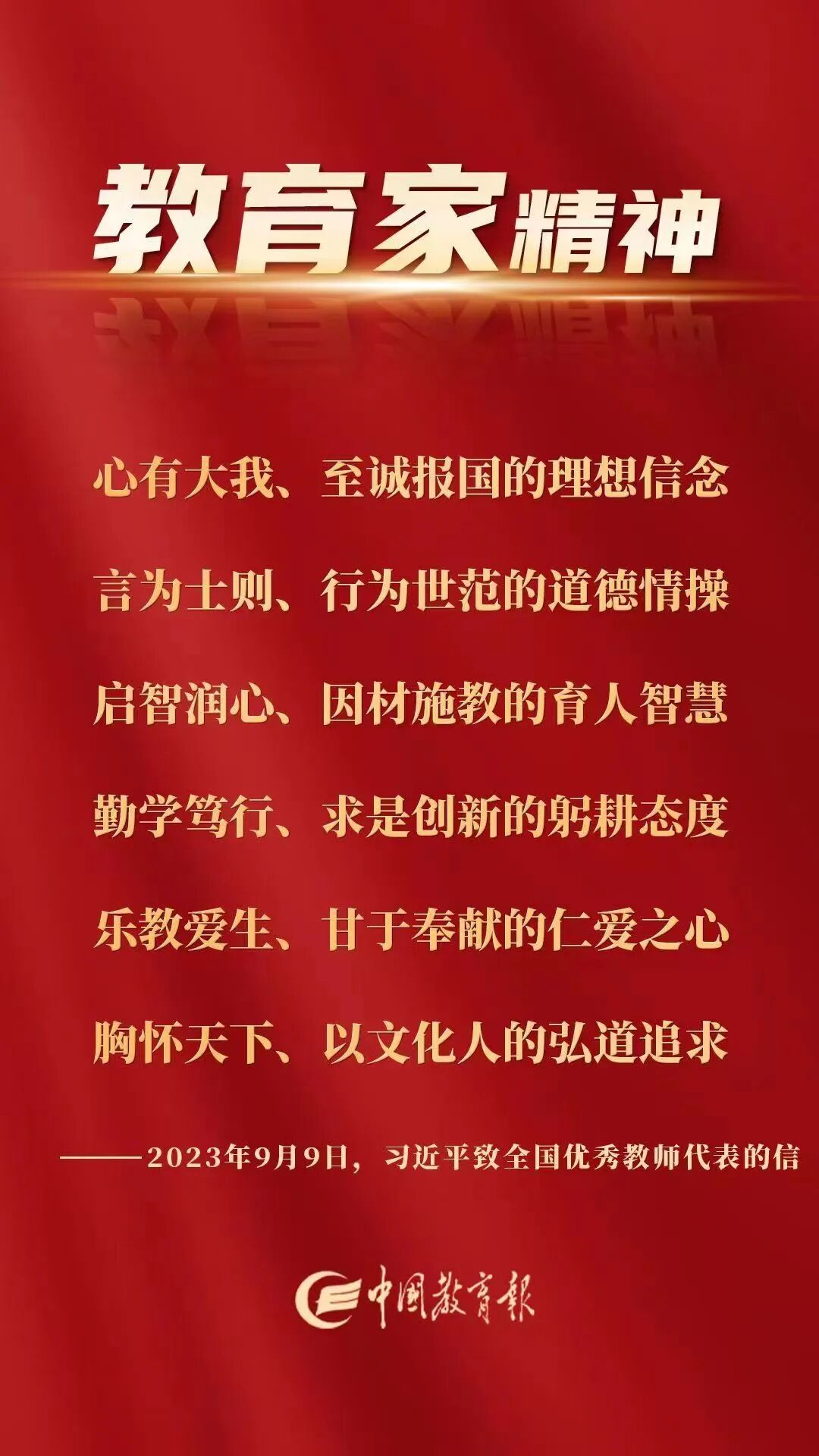 长期以来,以你们为代表的全国广大教师认真贯彻党的教育方针,教书育人、培根铸魂,培养了一代又一代德智体美劳全面发展的社会主义建设者和接班人,造就了大批可堪大用、能担重任的栋梁之才,为国家发展、民族振兴作出了重要贡献。教师群体中涌现出一批教育家和优秀教师,他们具有心有大我、至诚报国的理想信念,言为士则、行为世范的道德情操,启智润心、因材施教的育人智慧,勤学笃行、求是创新的躬耕态度,乐教爱生、甘于奉献的仁爱之心,胸怀天下、以文化人的弘道追求,展现了中国特有的教育家精神。